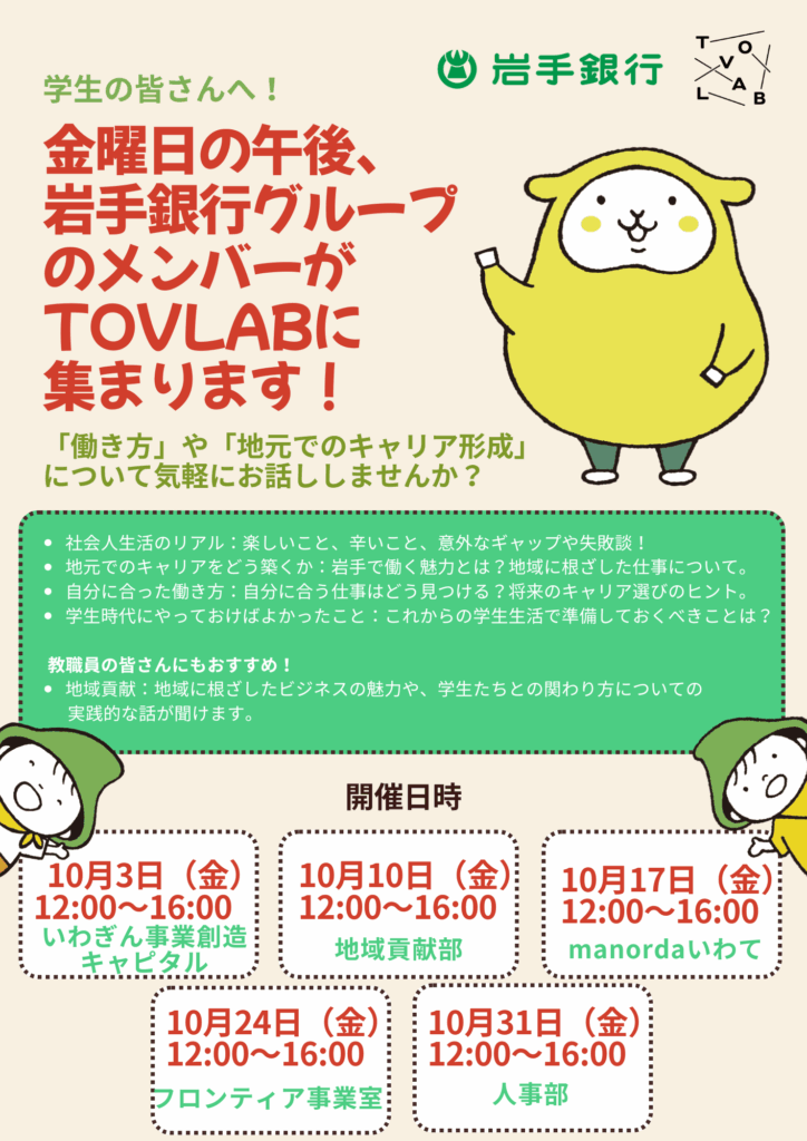 2025年10月3日,10日,17日,24日,31日 【岩手銀行グループ×TOVLAB】地域企業と学生の対話イベント