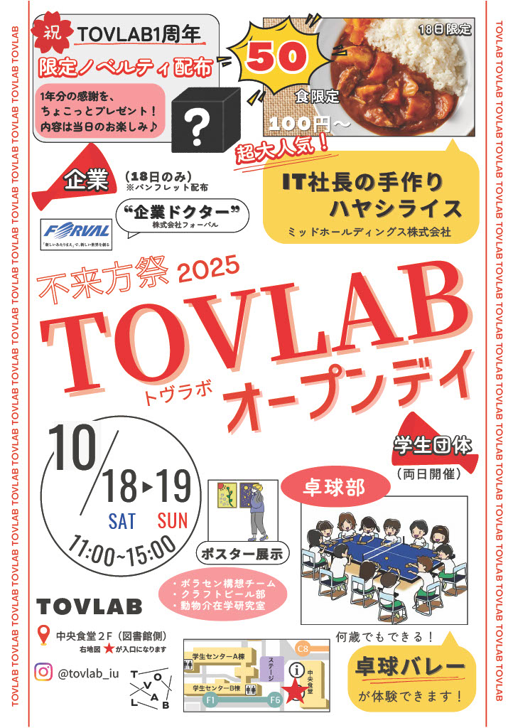 学生、地域の方、企業の方誰でも大歓迎です!色々な企画が目白押しですので、普段TOVLABに来ない方もぜひいらしてください!!!お待ちしております!