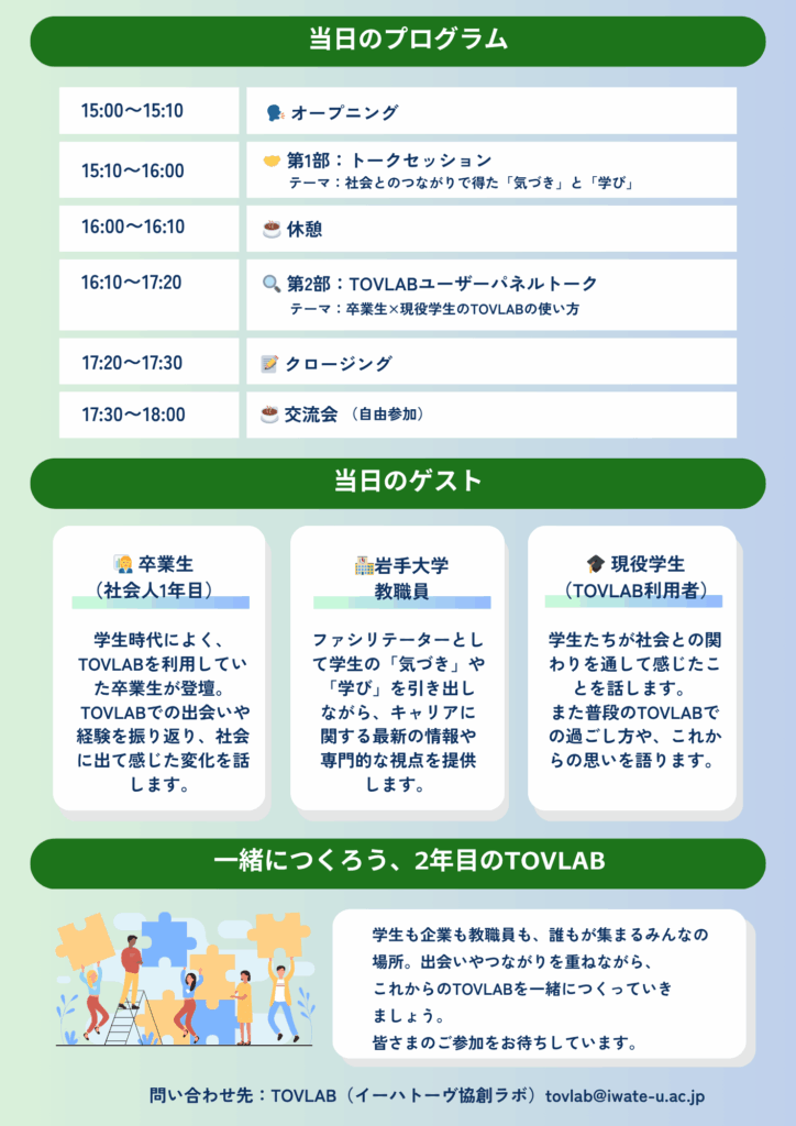 これまでTOVLABに関わってくださった学生・企業・大学関係者・地域のみなさんへの感謝を込めて、1周年イベントを開催します。