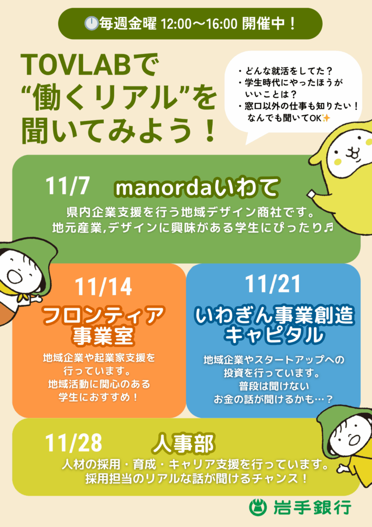 2025年11月7日,14日,21日,28日【岩手銀行グループ×TOVLAB】地域企業と学生の対話イベント